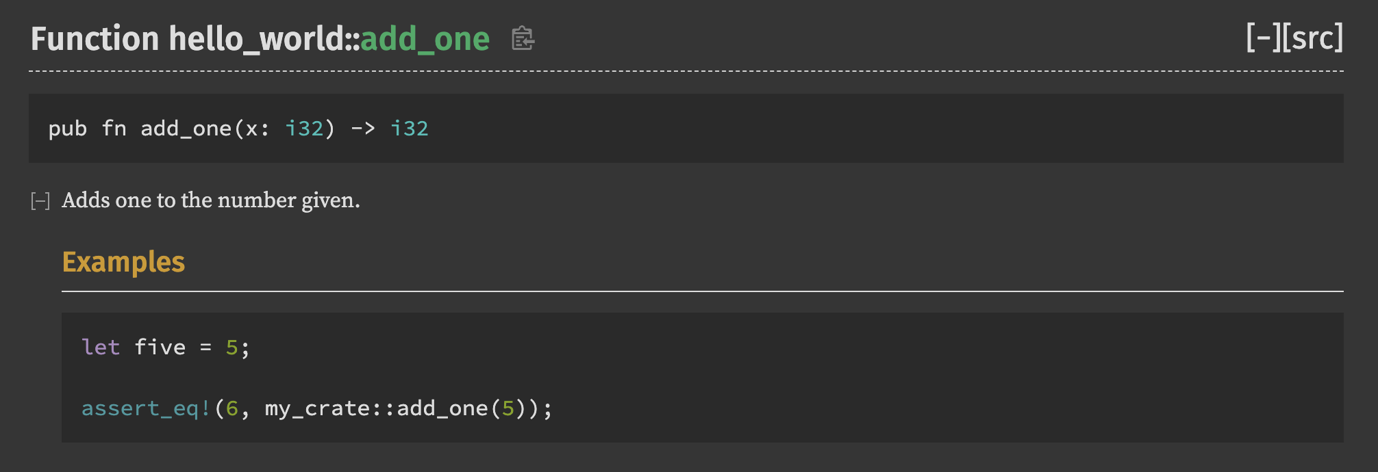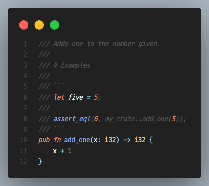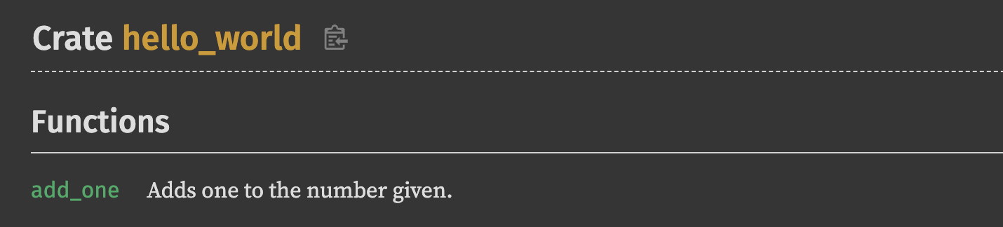 해당 코드가 target/doc 에 저장되며 cargo doc --open 명령어를 입력 시
